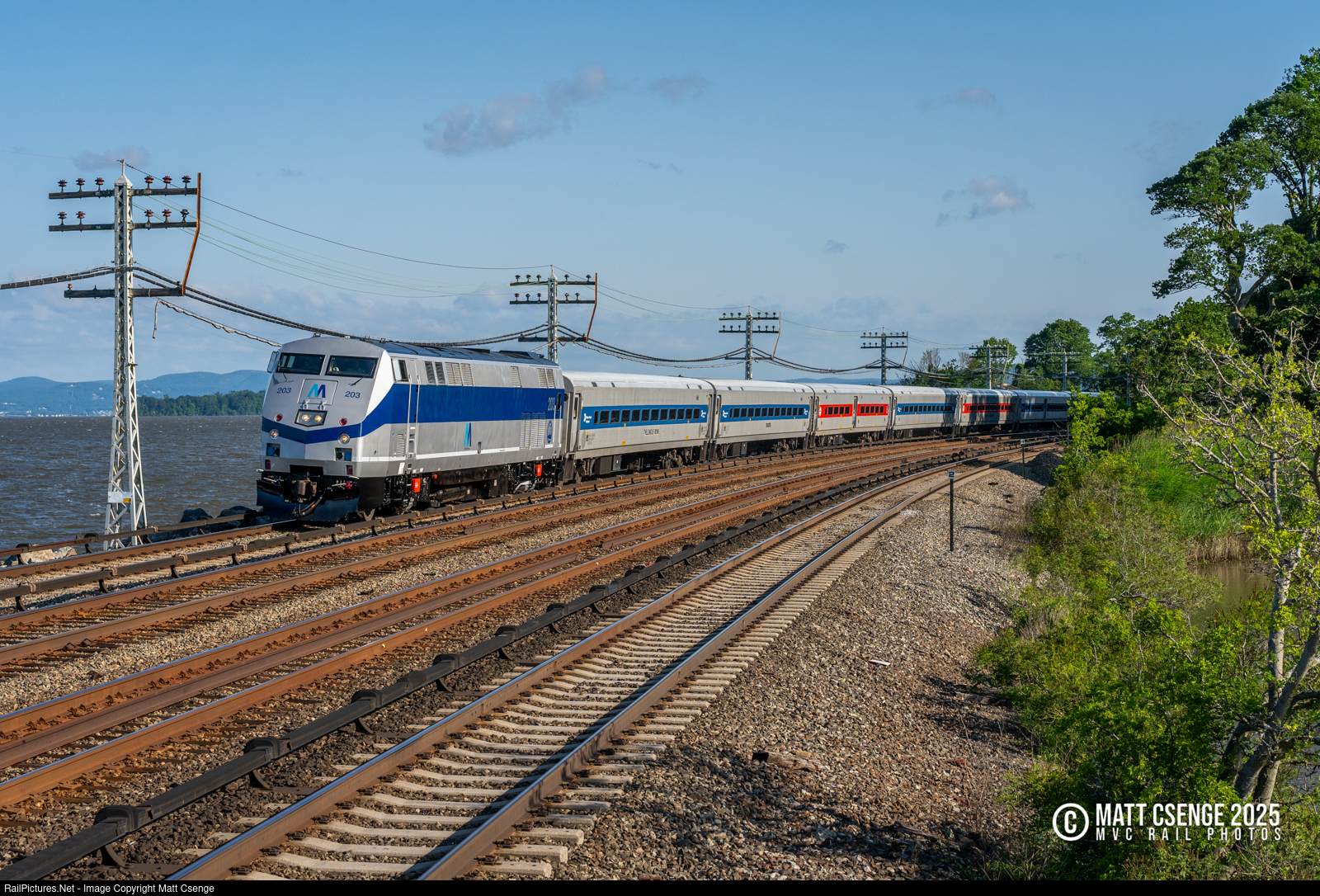 Metro-North Railroad P32AC-DM no. 203 is seen approaching Scarborough Station on its maiden voyage in new "M Central" heritage paint. Like the railroad's other heritage units, the inaugural run saw the locomotive facing south, in this case leading Hudson Line train 734 from Croton-Harmon to Grand Central Terminal. |