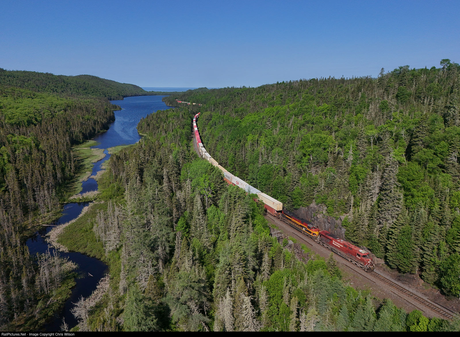 | CPKC's Heron Bay Subdivision turns away from Lake Superior at mile 87 for a about 10 miles west passing a few smaller lakes. Here just west of Steel the rails twist along Little Steel Lake for about three miles complete with the Steel Tunnel before crossing the Steel River and back alongside Lake Superior at mile 96. |