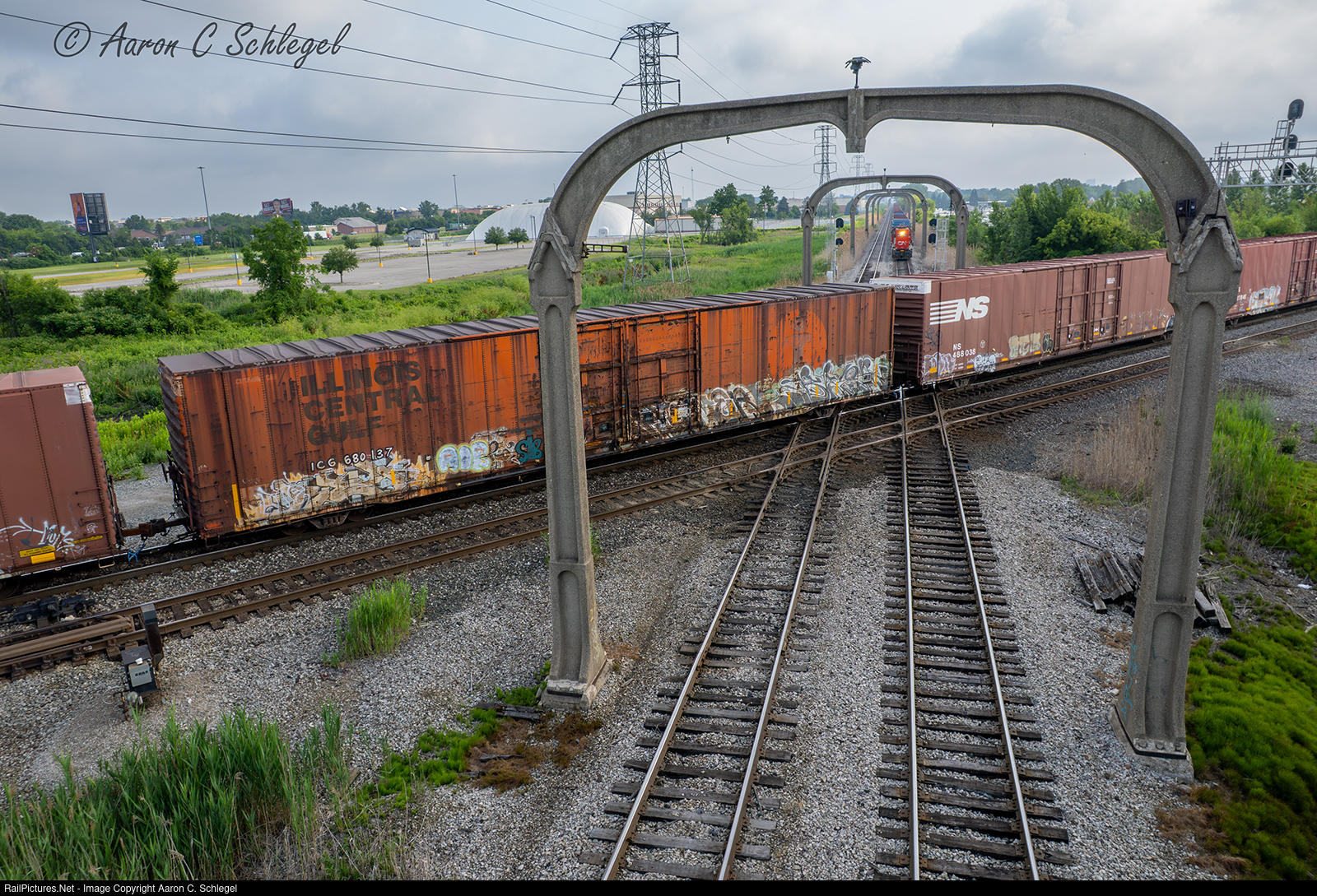 | GTW 5817 waits to go south from Shafer Yard at Oakwood Junction. A West bound NS train pulls across the Diamond as it departs Oakwood Yard on the old Wabash Line. The ICG 86 foot boxcar is designed specifically for auto parts. The Edison Arches at Oakwood still stand. These Arches were built when Hennery Ford owned the DT&I. This was Fords attempt at Electrifying the Line. Two Test runs with Eclectic Locomotives were made in 1925. The Arches were built at the Rouge Plant Steelworks with rebar and Ford Concrete. |