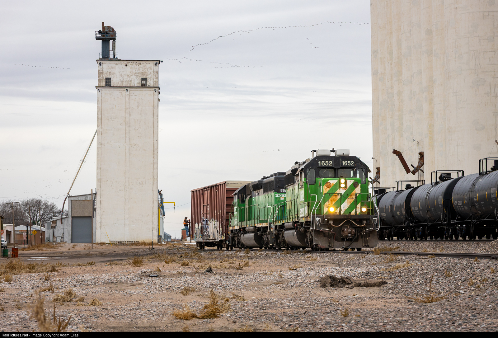 | A duo of BN greens pulling a lone boxcar off an industry track in downtown Yuma, Colorado, on the BNSF Akron Sub. A flock of geese can be seen doing their migrating business above. |