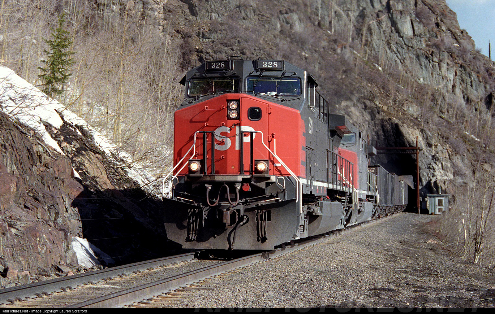Southern Pacific 328 E/B leads a Texas Coal train out of the Pando Tunnel on the west side of Tennessee Pass on April 9, 1997. This was a Union Pacific coal train with 4 mid train manned helpers and 2 rear manned helpers.