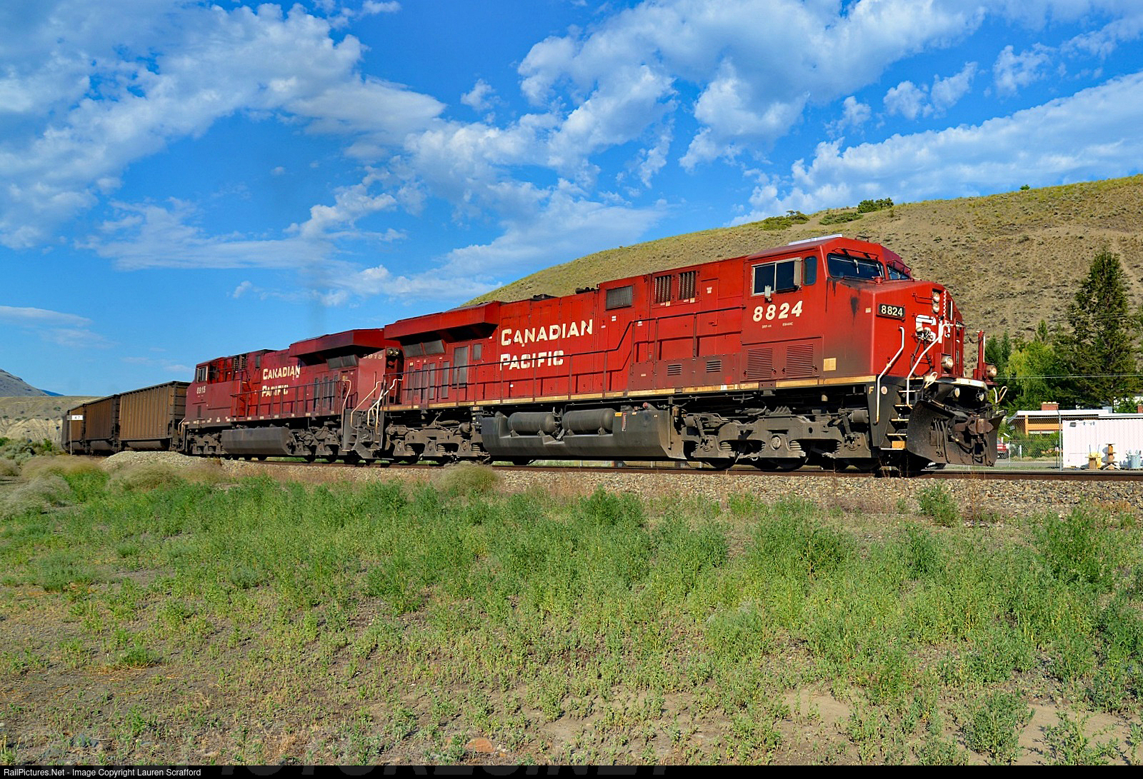 | Canadian Pacific, CP 8824 W/B Export Coal Train entering Ashcroft, BC on June 27, 2015, along with CP 8915 and a single rear DPU. |