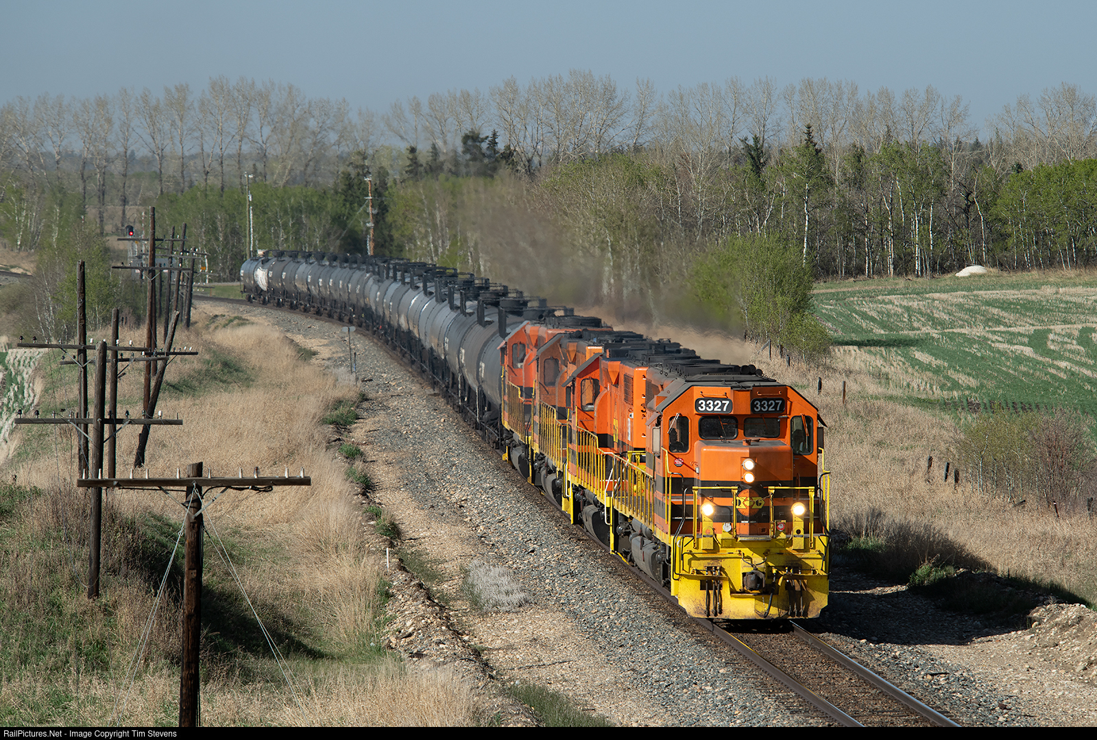 | QGRY SD40-3 3327, RDR GP38-2 3531, BPRR SD40-3 3328 and RDR SD40-3 3403 hustle 23 LPG loads south on CPKC's Leduc Sub just north of Blackfalds. The Red Deer Railway recently purchased CPKC's Hoadley Sub and their southbound RD2-06 job is now running via trackage rights on the Leduc Sub between Jackson and Red Deer with a train that originated at the LPG plant at Homeglen. |