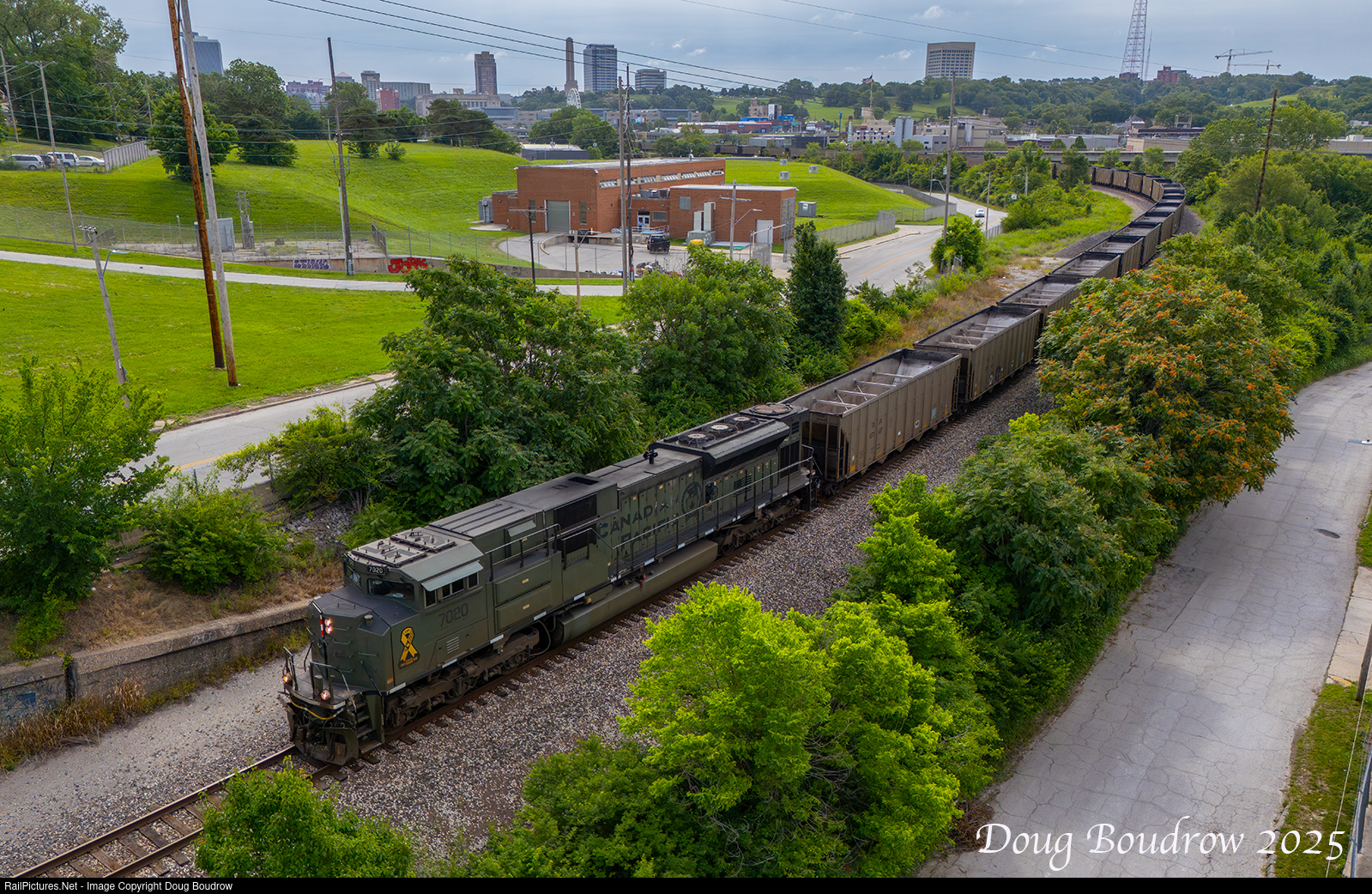 | Canadian Pacific 7020 is seen leading an empty coal train off the Kansas City Terminal main and toward West Bottoms. CP 7020 is painted in a scheme to honor the Canadian Air Force. I was flying the drone just after arriving at Santa Fe Junction when this train snuck up on me. |