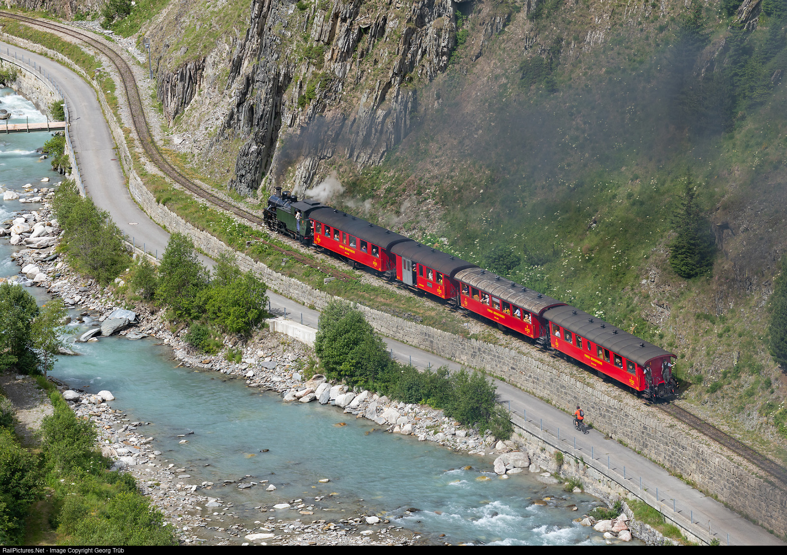 | Train 133 of the Dampfbahn Furka Bergstrecke (DFB) left Realp shortly for the journey over the Furka pass to Gletsch and Oberwald. Cogwheel steamlocomotive HG 4/4 # 704 (SLM 1923) pulls the train on the adhesion section through the gorge of the Furkareuss. On the platform of the last car we can see conductor Markus G. from Dietlikon. |