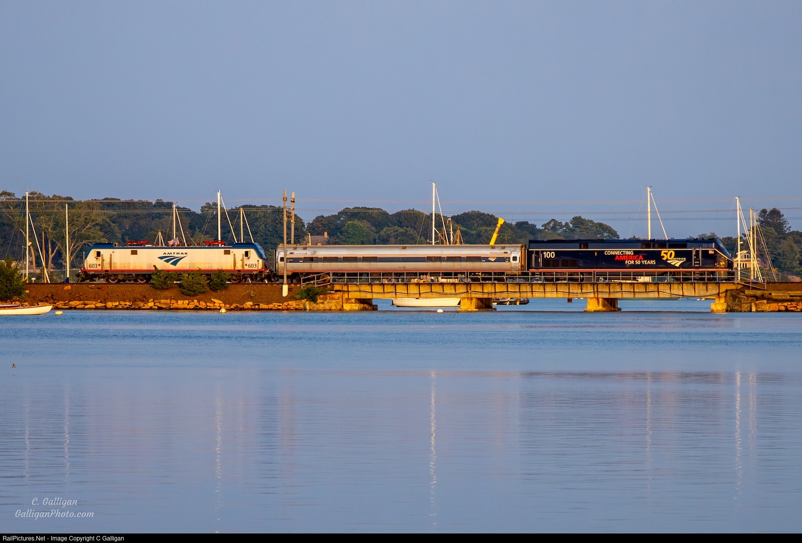 | An Amtrak equipment move crosses Beebe Cove in Noank, CT with Midnight Blue P42DC 100 towing an Amfleet Cafe and ACS-64 to New Haven. |