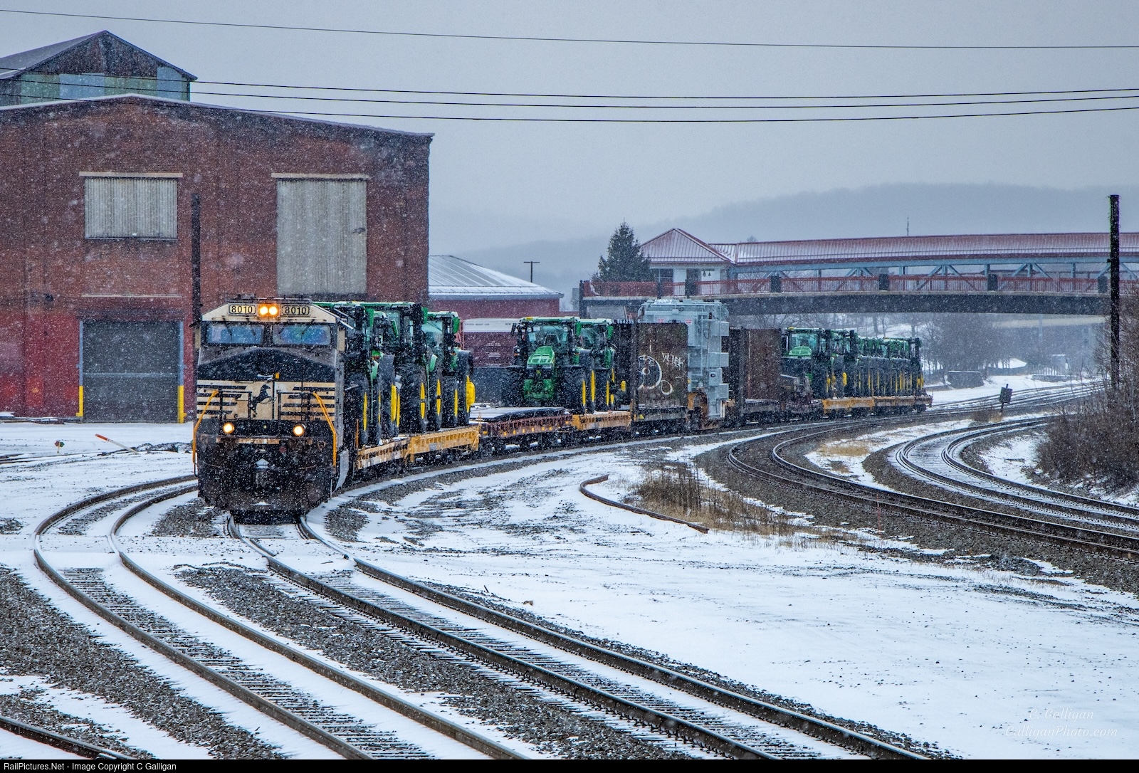 | Norfolk Southern High and Wide special 054 comes into Altoona, PA with a variety of tractors and transformers that are easier to move on their own unique train. |