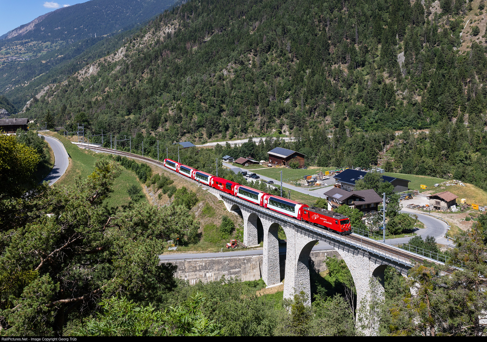 | Cogwheel locomotive HGe 4/4 II # 107 of the Matterhorn-Gotthard-Bahn (MGB) pulls the PE 904 GLACIER EXPRESS from Zermatt to St.Moritz over the 96 meter long Grengiols viaduct between Grengiols and Lax. The locomotive is in charge from Zermatt to Disentis. |