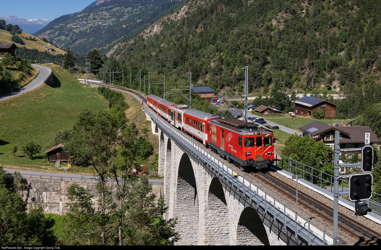 | Baggage cogwheel railcar Deh 4/4 II # 93 of the Matterhorn-Gotthard-Bahn (MGB) pulls the regional push-pull train 526 of the line R43 from Visp via Brig-Oberwald to Andermatt, crossing the 96 meter long Grengiols viaduct between Grengiols and Lax. |