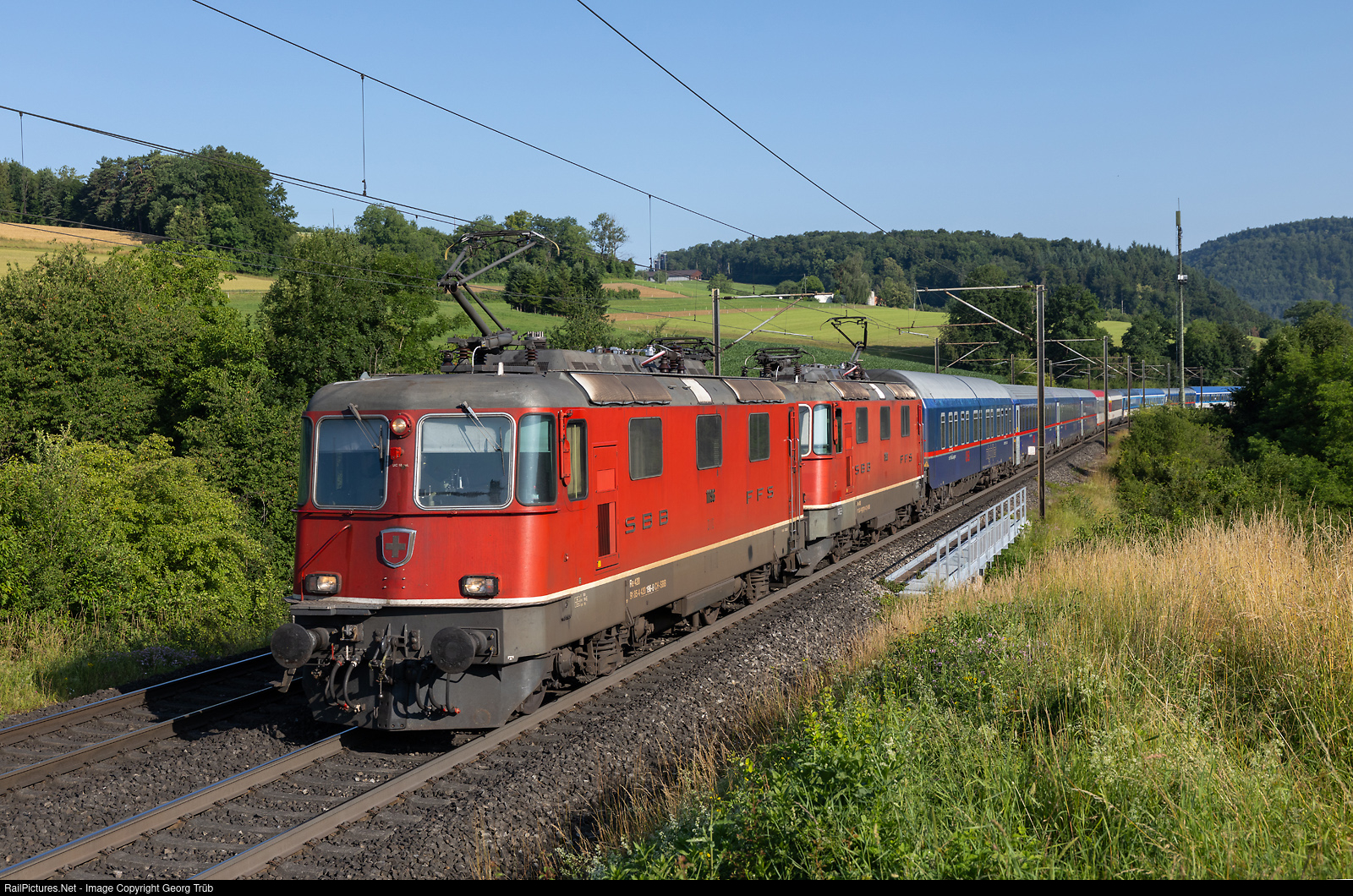 | Re 420 # 196 and # 301 (Re 4/4 II # 11196 and # 11301) of the SBB in multiple control pull the NightJet NJ 458 from Prag-Dresden and Berlin via Basel to Zürich, on the Bözberg north ramp between Hornussen and Effingen. |