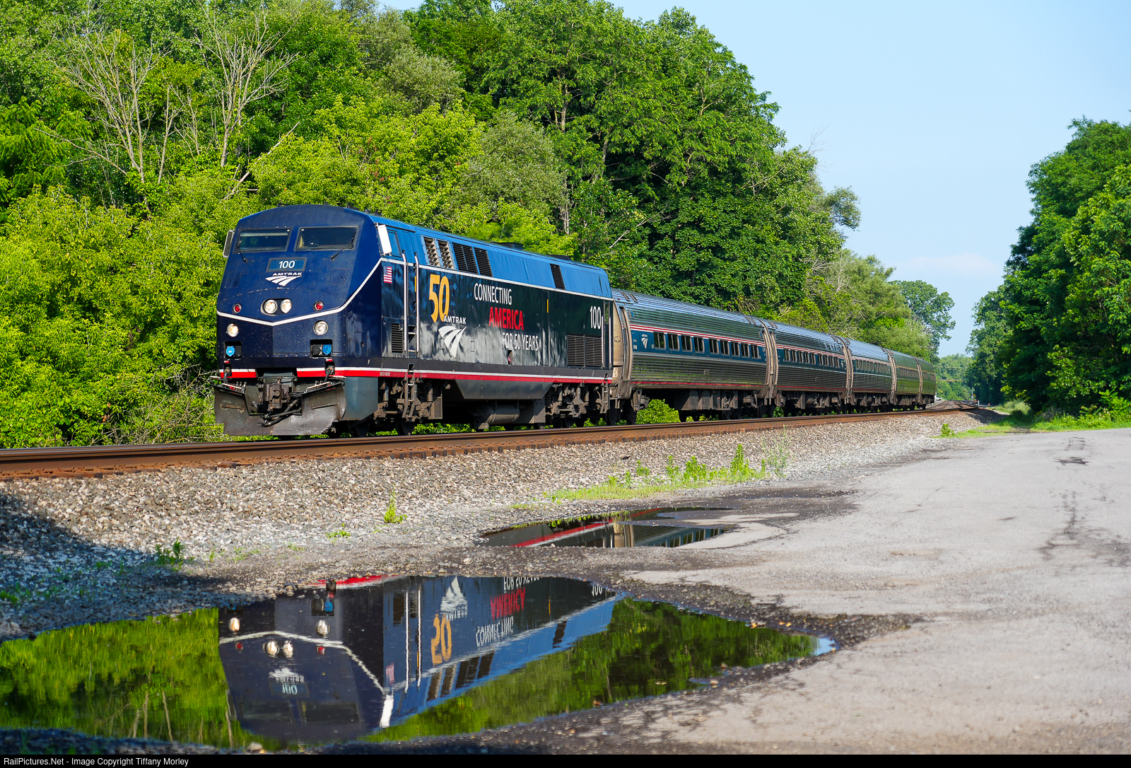 RailPictures.Net Photo: AMTK 100 Amtrak GE P42DC at Fairport, New York by Tiffany Morley