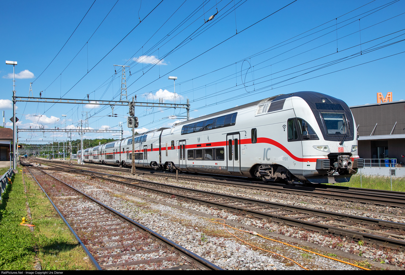 | The six-car doubledeck intercity trainset 4010 101/601 of DB AG passes through the Hüntwangen-Wil station without stopping on its way from Stuttgart Hbf (Germany) to Zürich HB (Switzerland). |