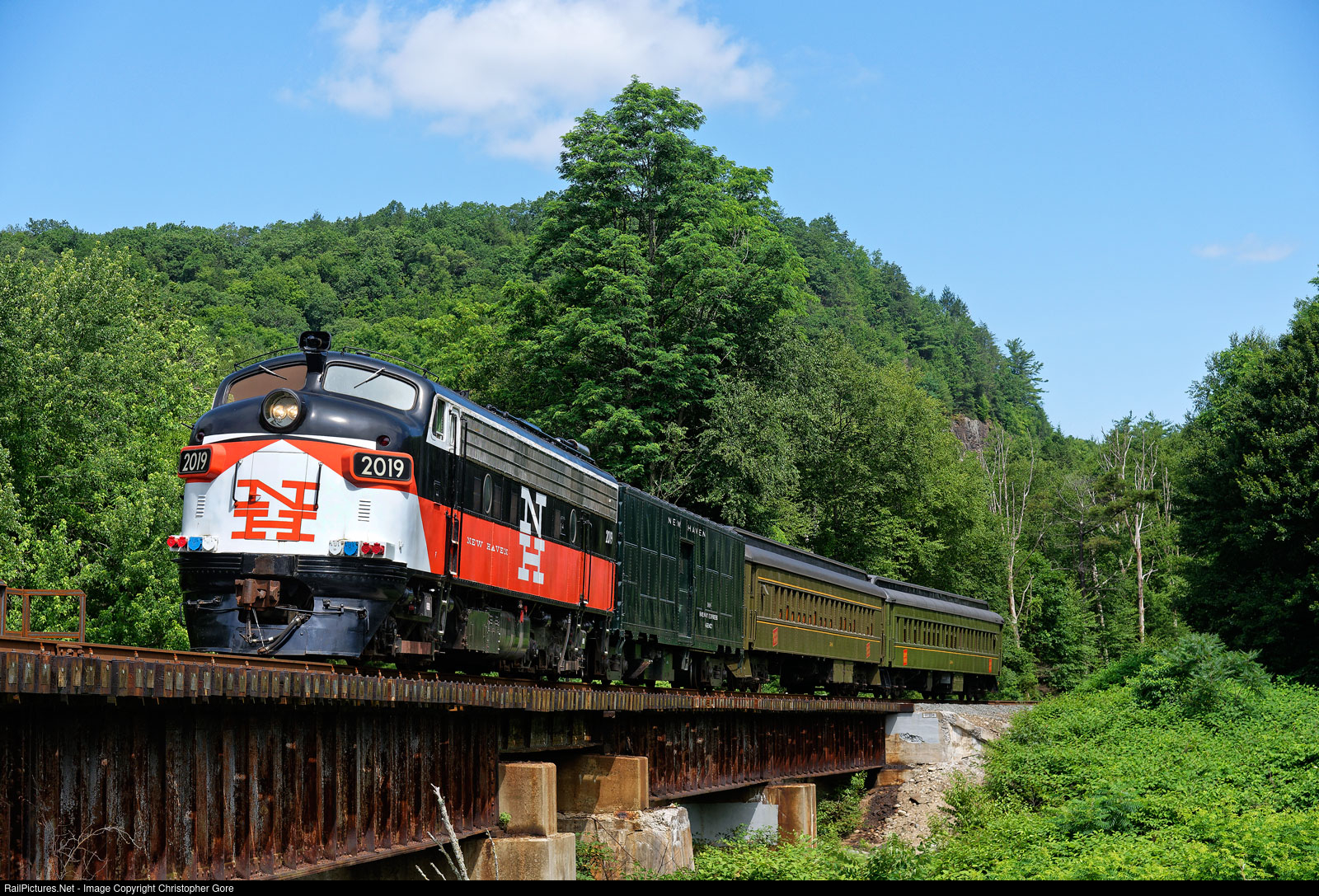 New Haven FL9 2019 crossing Jericho bridge during Railroad Museum of New England's Railfan Day with Locomotive 2019.