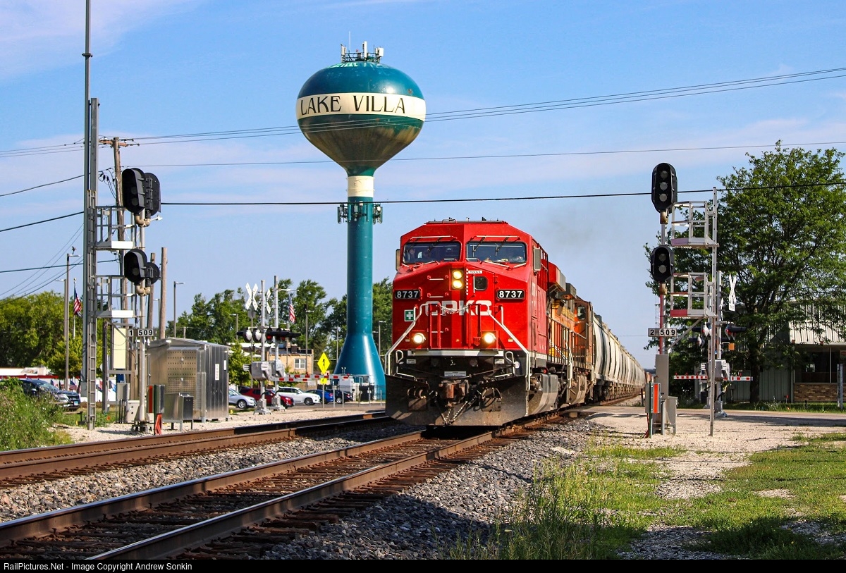 On the morning of July 2nd, while Metra’s morning NCS service began to wind down, Canadian National regional freight A490 from Wisconsin Rapids to Kirk Yard screams southwards down the Waukesha Sub with a leader that seems out of place! The Canadian Pacific (Kansas City) GE ES44AC, sporting the new merger scheme No. 8737 commands the train with a BNSF C44-9W trailing behind. It’s not the first time a CP locomotive has been on these rails as numerous other locomotives have, but in the new merger scheme, it is for the 8737. Both crew members aboard waves to me as they head towards the EJE in Mundelien.