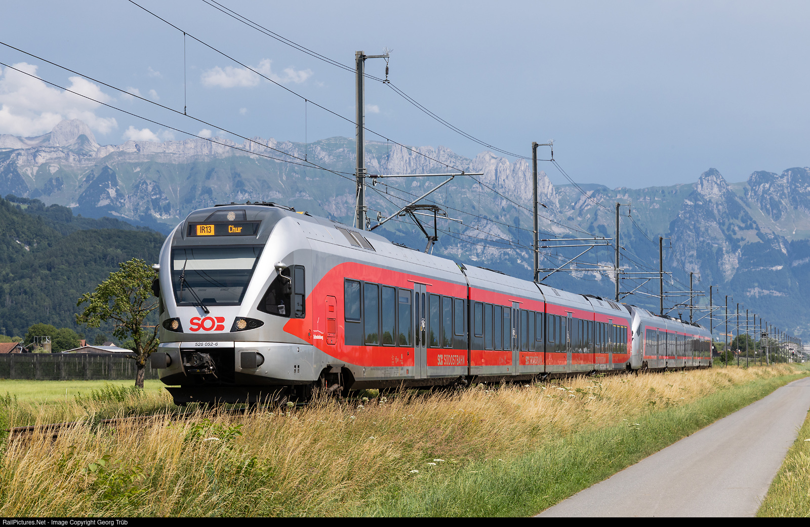 The IR13 ALPENRHEIN EXPRESS, newly introduced in December 2024, is normally operated by a “Traverso” RABe 526 from Südostbahn. Exceptionally, two “Flirt” RABe 526 # 052 and # 010 (Flirt 3) are traveling in multiple control with the IR 2209 from St. Gallen to Chur, between Sevelen and Trübbach.
