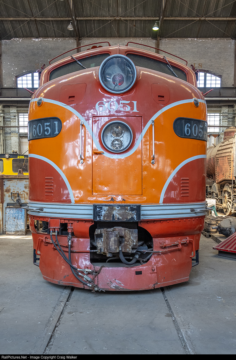 Off display and back in the old Central Pacific Shop complex (much of it built in 1968) where the California State Railroad Museum stores and works on a variety of equipment in their collection, is Southern Pacific E9A 6051, wearing the classic Daylight paint scheme in which it was delivered … Minus its nose shield, which has been removed for safekeeping (and possibly refurbishment?). (Sacramento, California – June 23, 2025)
