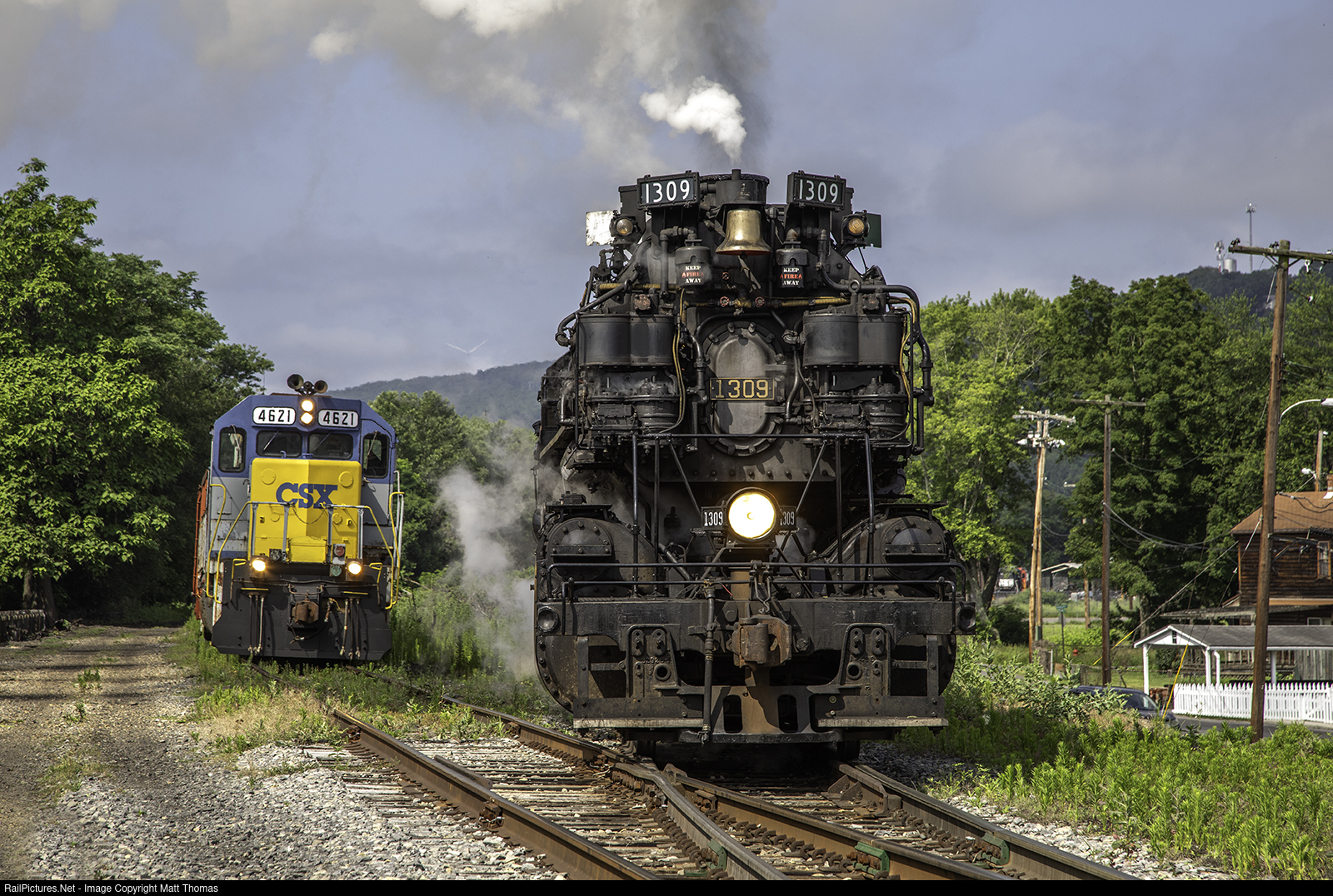 | Western Maryland Scenic hosted a Fireball Photo Experience. Seen here is Western Maryland Scenic's 1309 (ex C&O 1309) built in 1949 departs Ridgley Yard alongside CSX 4621 built in 1966 (ex WM SD40 7496). If I did the math right 17 years of railroad technology separate the two locomotives.