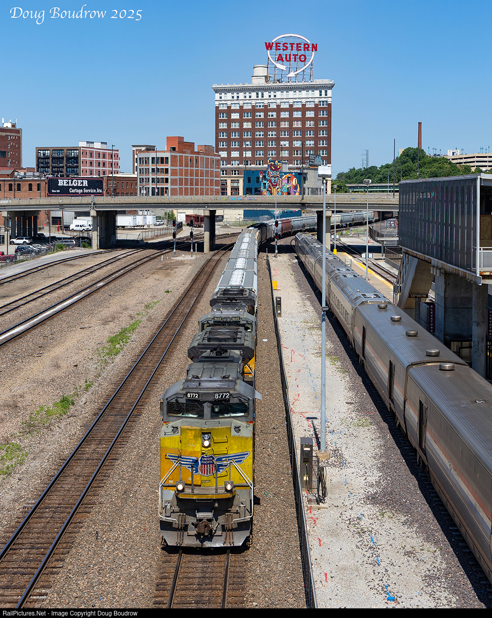 | Spanning the Freight House and Union Station, The Freight House Footbridge in Downtown Kansas City is one of the best places in the country to watch trains, seeing upwards of 100 movements per day. Once located at the KC riverfront, the 250 foot long Pencoyd Bridge was built in 1892 and closed in 1970. The bridge was moved to its current location in 2006 and repurposed as a pedestrian bridge with a semi enclosed walkway in the middle. My third train of the afternoon that I shot was a Westbound Union Pacific grain train. |