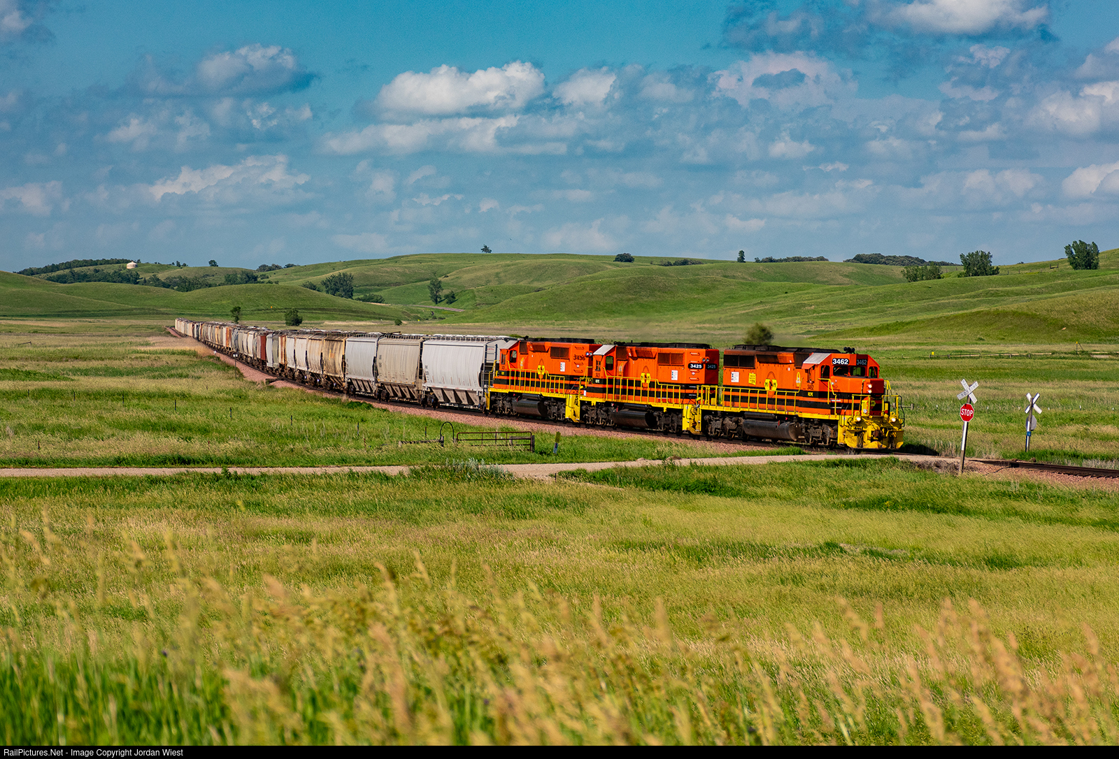 Late in the afternoon, RCPE's Mankato to Aurora train makes its way through the rolling hills of the Buffalo Ridge in Lake Benton. Though it may look like a typical summer day in this photo, the weather was soon to take a turn, as a storm was brewing to the north. Said storm produced a couple tornadoes which we saw 30 some miles away. Quite the eventful day it was.