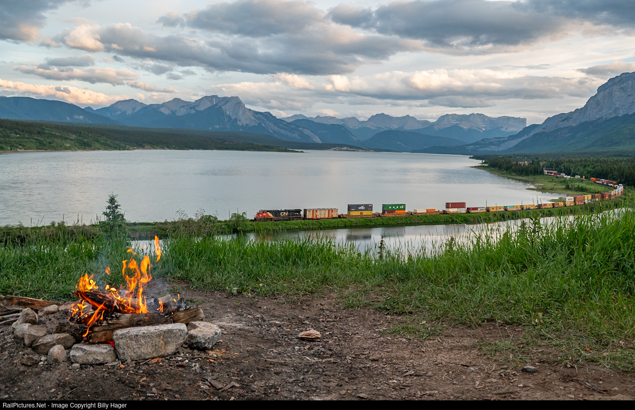 | Eastbound CN 198 passes through the scenic Swan Landing, on their way towards Edmonton with a long intermodal train, at almost 10 PM on one of the longest days of the year |
