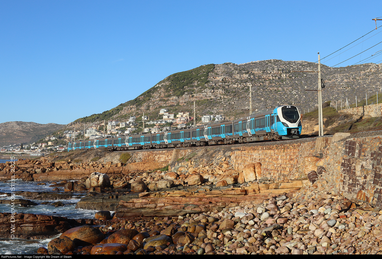 | The X'Trapolis series are Alsthom's generic multiple unit passenger train. The X'Trapolis - Mega 3'6" (1065mm) variant has been built in South Africa since 2017. Set No. 149 is seen skirting the shoreline near Glencain, on the scenic Simonstown line |