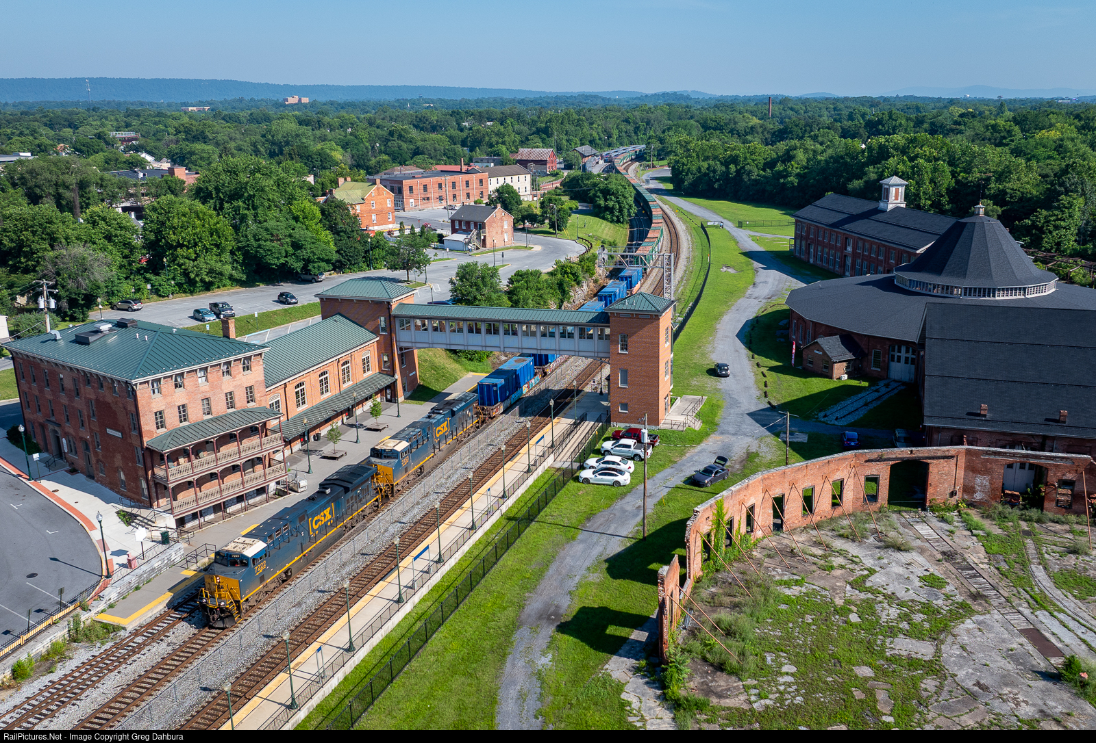 M407 passes the former B&O Roundhouse complex in Martinsburg as well as the Amtrak Station on a nice summer morning.