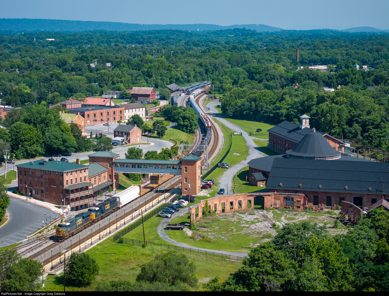 M415 rolls past the former B&O complex at Martinsburg with an older GE leading a SD70MAC rebuild. Currently the complex is an events center and has slowly been undergoing restoration.