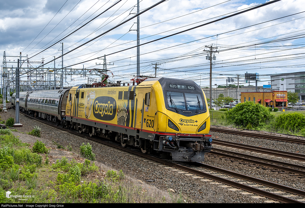 On May 26th, 2025, Amtrak's Crayola-wrapped ACS-64 #620, leads Regional Train 87 west past the Popeyes in Stratford, Connecticut along Metro-North's New Haven Line. 620 is one of two locomotives wrapped in special Crayola schemes as part of a partnership to promote family travel and creative exploration. This unit features the color Dandelion, a golden yellow and one of the fan-favorite crayon colors brought back from retirement, and stars crayon character "Dan D," the Crayola Ambassador of Creativity.