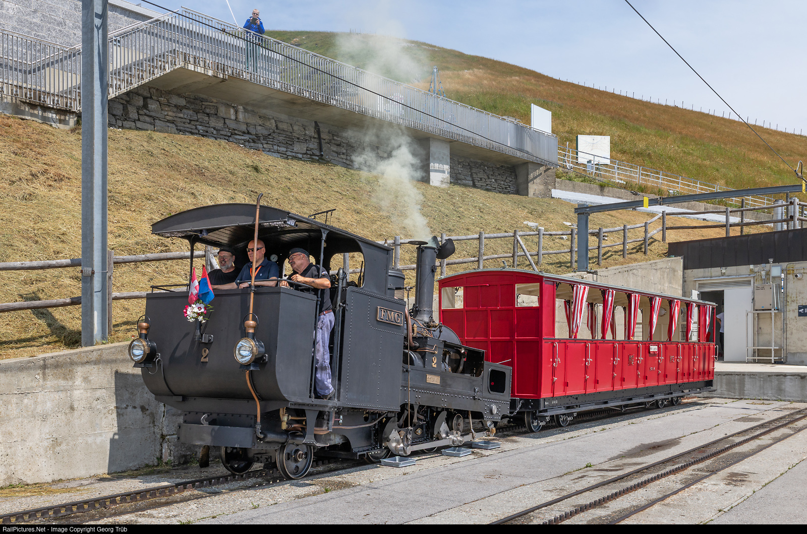 The 8.991-kilometer-long 80-centimeter narrow-gauge cog railway from Capolago on Lake Lugano (294 meters above sea level) to Generoso Vetta at 1,592 meters above sea level was opened in 1890. The steam locomotive H 2/3 # 2, built in 1890 by SLM in Winterthur for Ferrovia Monte Generoso (FMG), recently reached the mountain station with passenger car B # 2 (SIG 1890). This was the first public mountain trip after the locomotive and car were overhauled and refurbished by Martin Horath in Goldau.