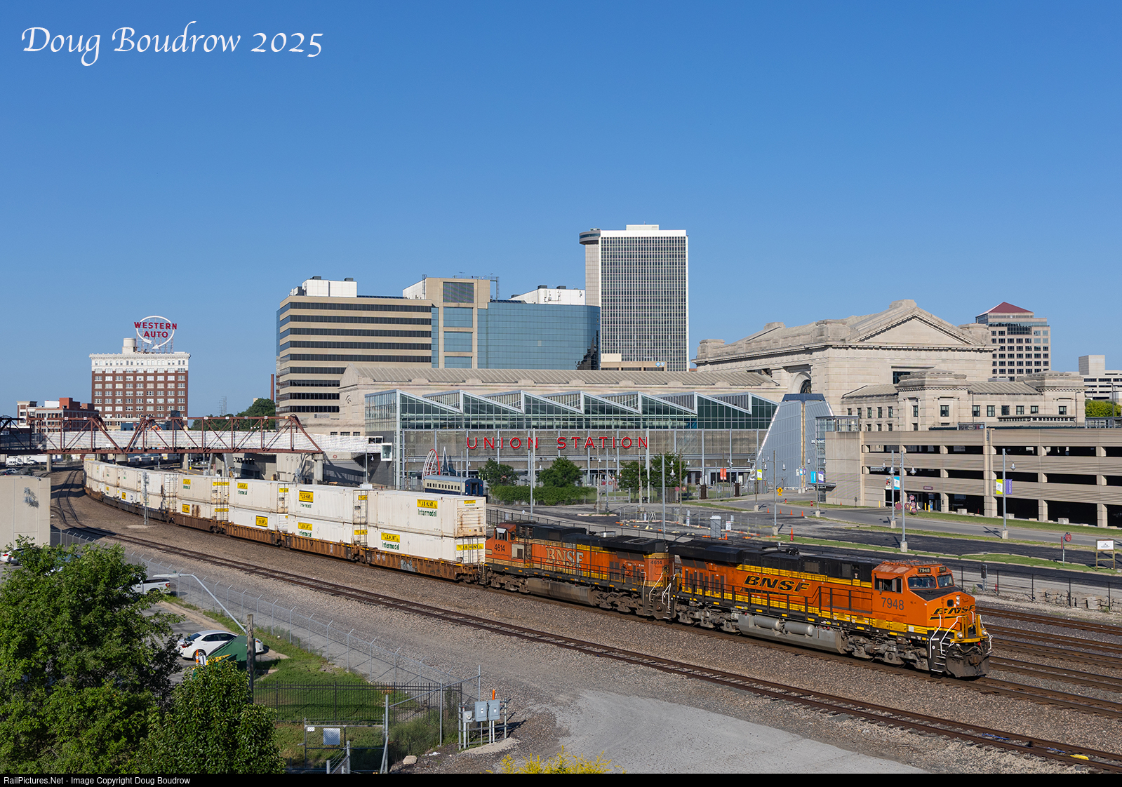 | A Westbound BNSF domestic intermodal train is seen passing through Downtown Kansas City. The Western Union Auto Building and Union Station are two of the most famous landmarks in the city and date back to 1914. |