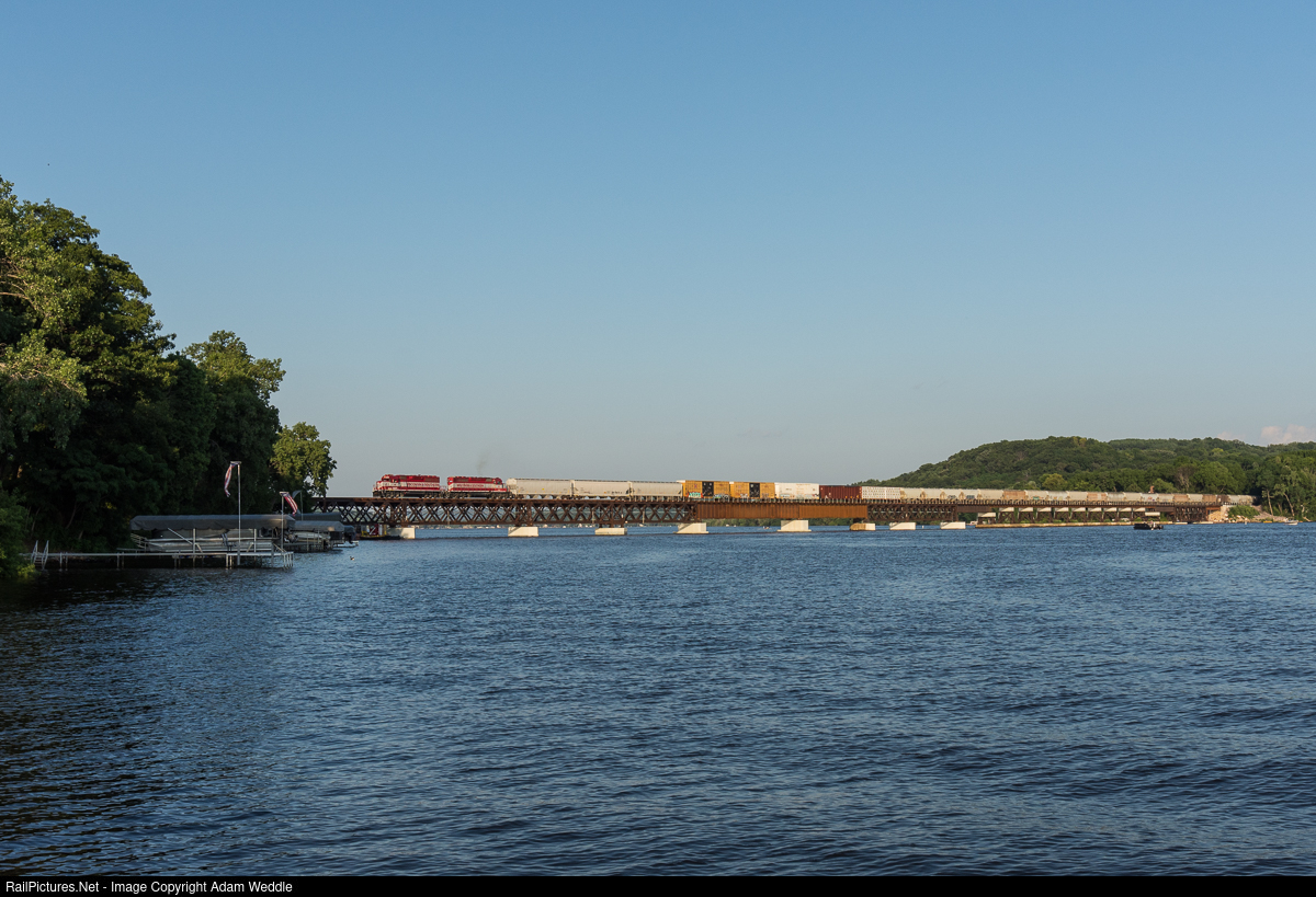 | L467 crosses the bridge spanning Lake Wisconsin at Merrimac. This bridge has been undergoing a rebuild over the last several years. When it is complete, the plan is to raise the speed over the bridge from 10 to 25 MPH. Also, the weight limit will be increased from 268,000 pounds to 286,000 pounds. |