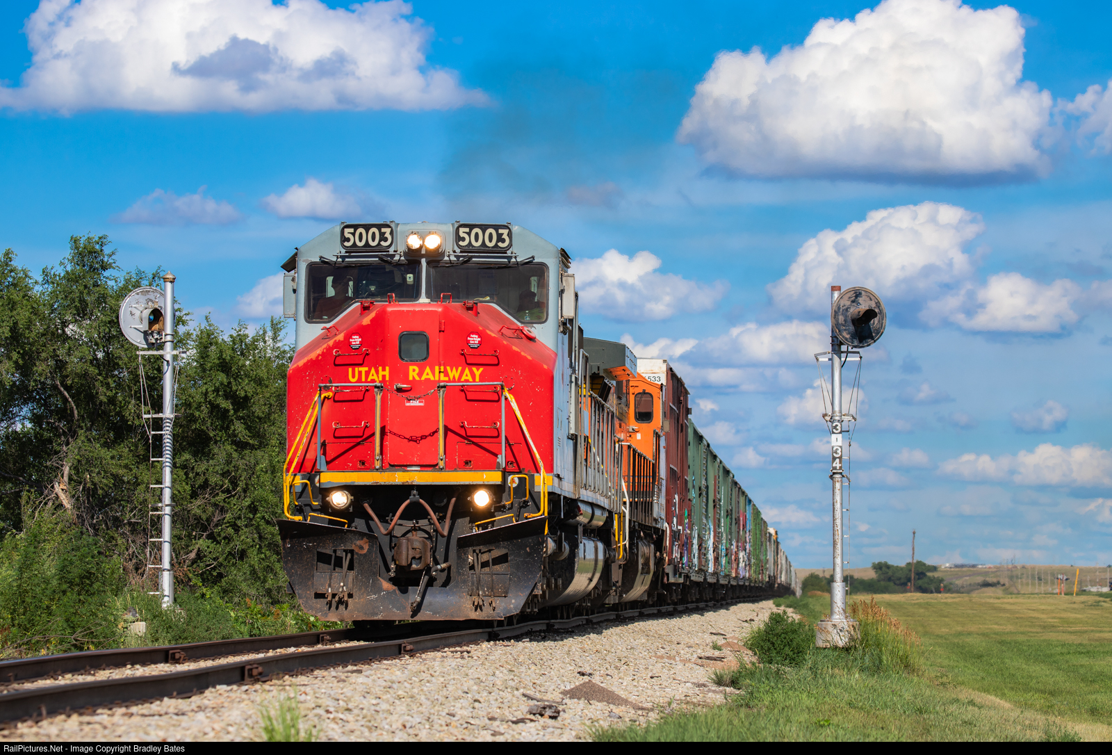 | UTAH MK50-3 #5003 leads KYLE westbound freight train SALI passed a pair of old and out of service Rock Island searchlight signals at Norton, KS. |