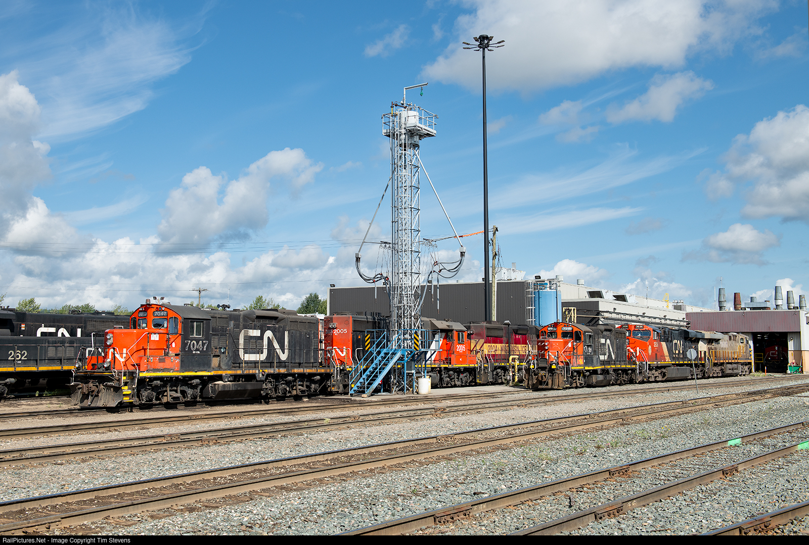Various power awaits shop attention at Prince George. CN 7047, WC 2005 and WC 2004 are a very active triple set used in beltpack operation here.