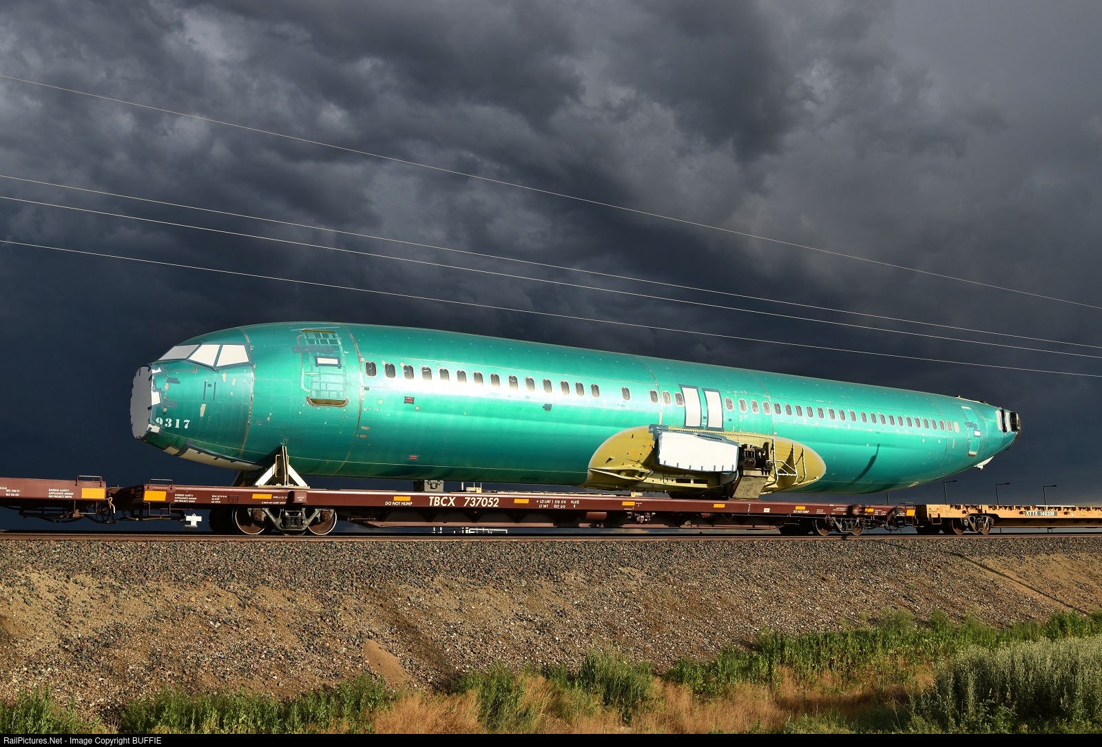 As ominous storm clouds lurk above, a BNSF special Q train with 3 Boeing 373 fuselages runs east on the Brush Sub through Hudson, Colorado.