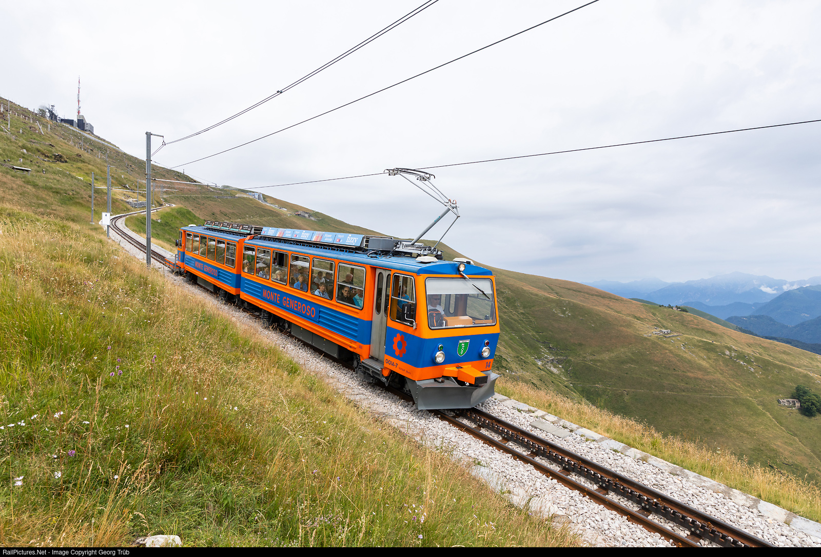 | Electric cogwheel train Bhe 4/8 # 14 "San Gallo" of the Monte Generoso railway is running down the mountain as train 18 of the line CC87 below the top. The railway has 4 of this trains built in 1982 by SLM and Siemens. |
