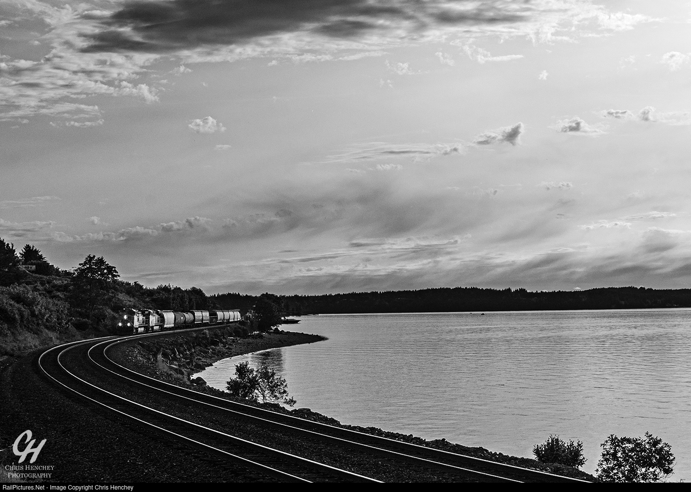 | The late afternoon of Memorial Day sees a Pasco to Everett manifest roll along the banks of Puget Sound as it approaches Sunnyside Beach and a southbound garbage train near Steilacoom. |