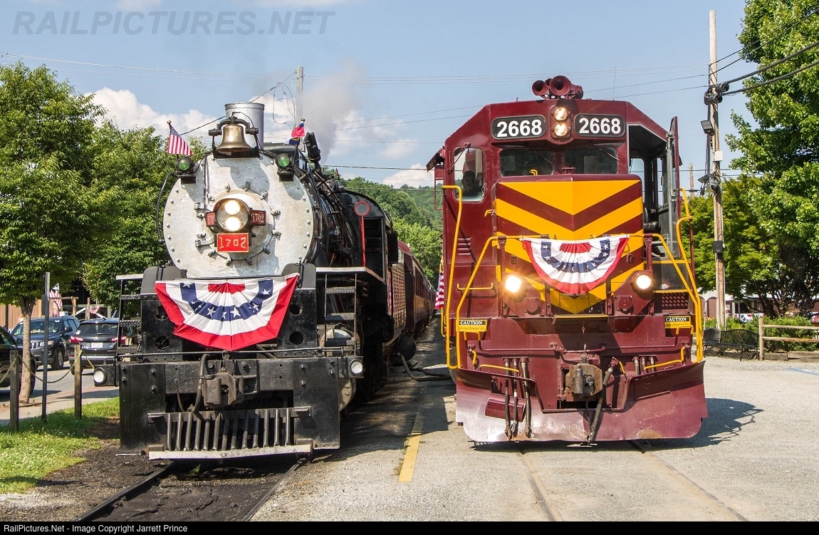 | 1702 rests in the siding after a Nantahala Gorge excursion as 2668 pulls up to let passengers depart from a Tuckasegee River excursion. |
