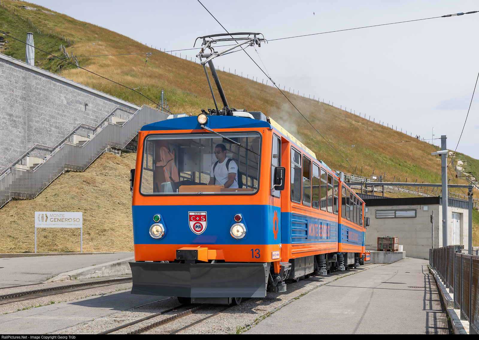 | Cogwheel train Bhe 4/8 # 13 "Salorino" of the Monte Generoso railway (80 centimeter gauge, Abt cogwheel system) in Generoso Vetta. The railway has 4 of this trains built in 1982 by SLM and Siemens. |