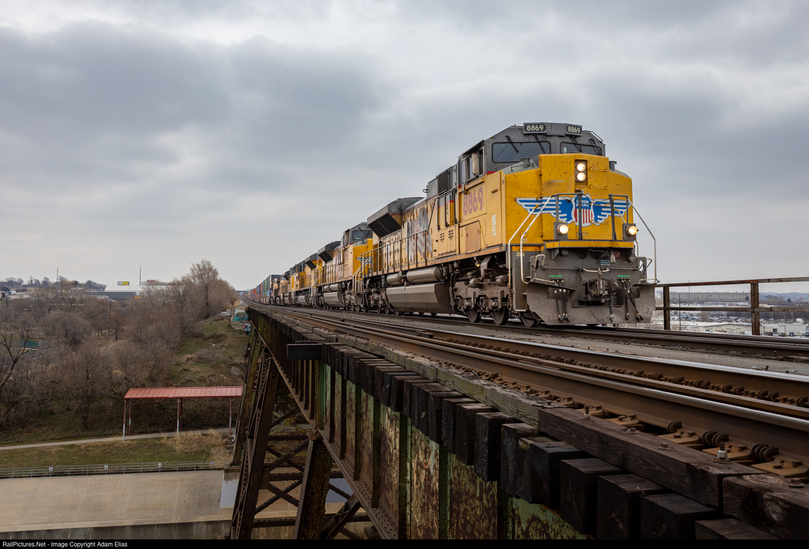 | UP 8869, three more SD70Aces, and two GEs pull a large MCBNP through Omaha, Nebraska, as they begin their trek towards North Platte. |