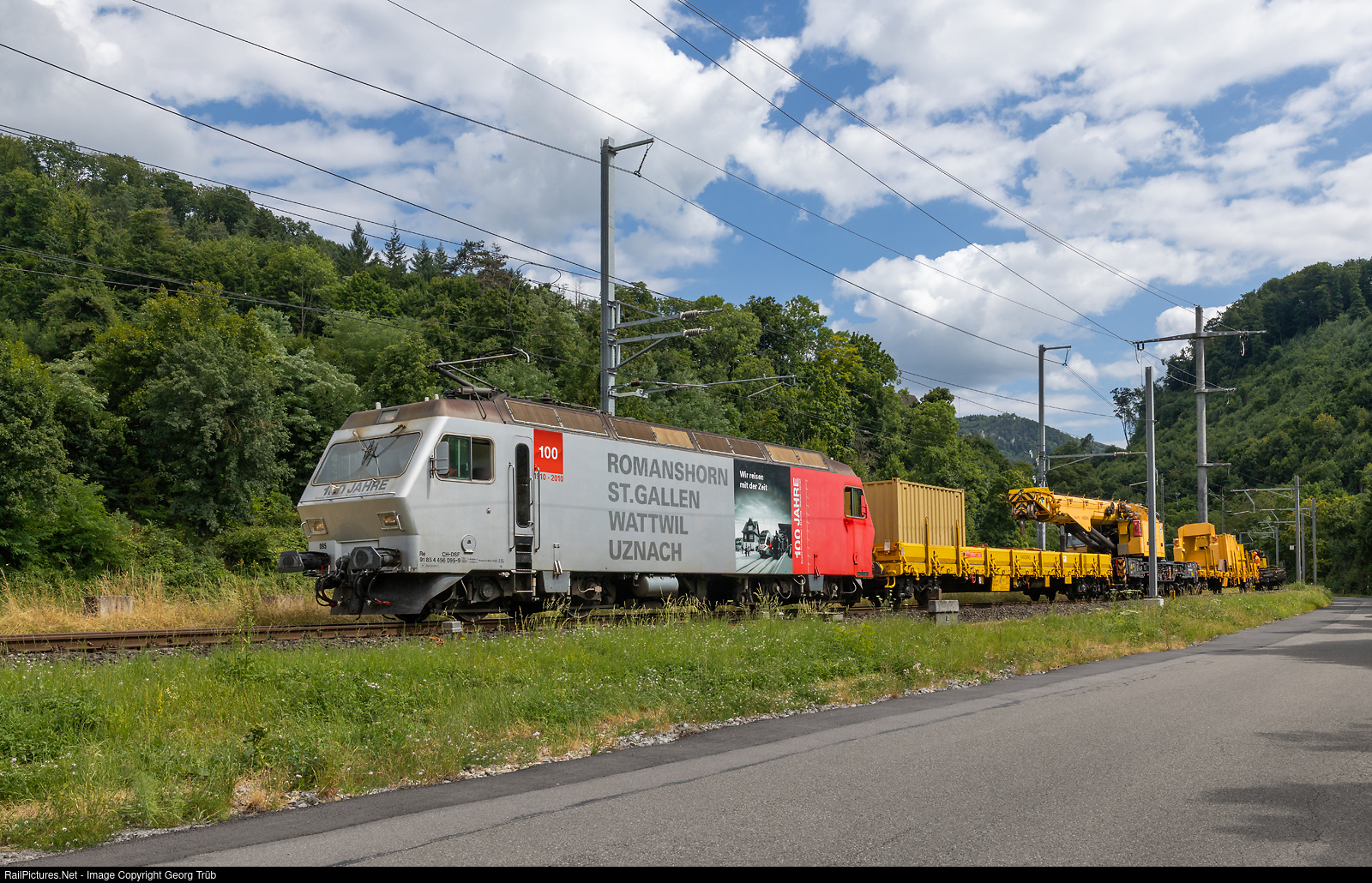| Former Bodensee-Toggenburg-Bahn/Südostbahn electrolocomotive Re 456 # 095 of the Depot- und Schienenfahrzeuge Koblenz (DSF), in the publicity paint scheme for 100 years Romanshorn-St.Gallen-Wattwil-Uznach line, is shunting with the freight train 69467 of the Oensingen-Balsthal Railway from Aesch to Basel shunting yard, at Aesch. The cars, two cranes and tamping machine came from the double track works between Grellingen and Duggingen. |