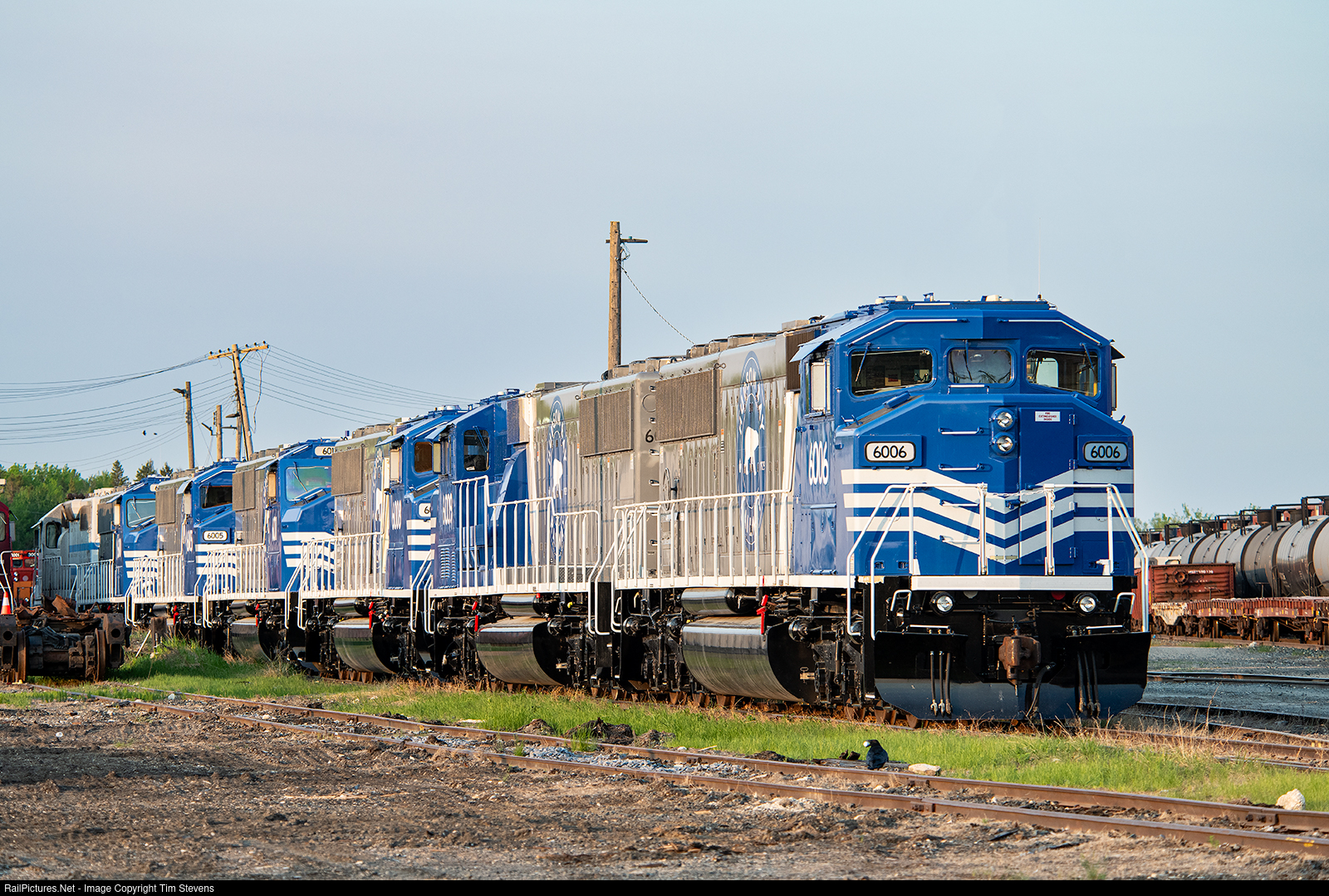 A string of fresh HBRY SD60Ms await their fate in The Pas, MB. They haven't turned a revenue wheel since arriving.