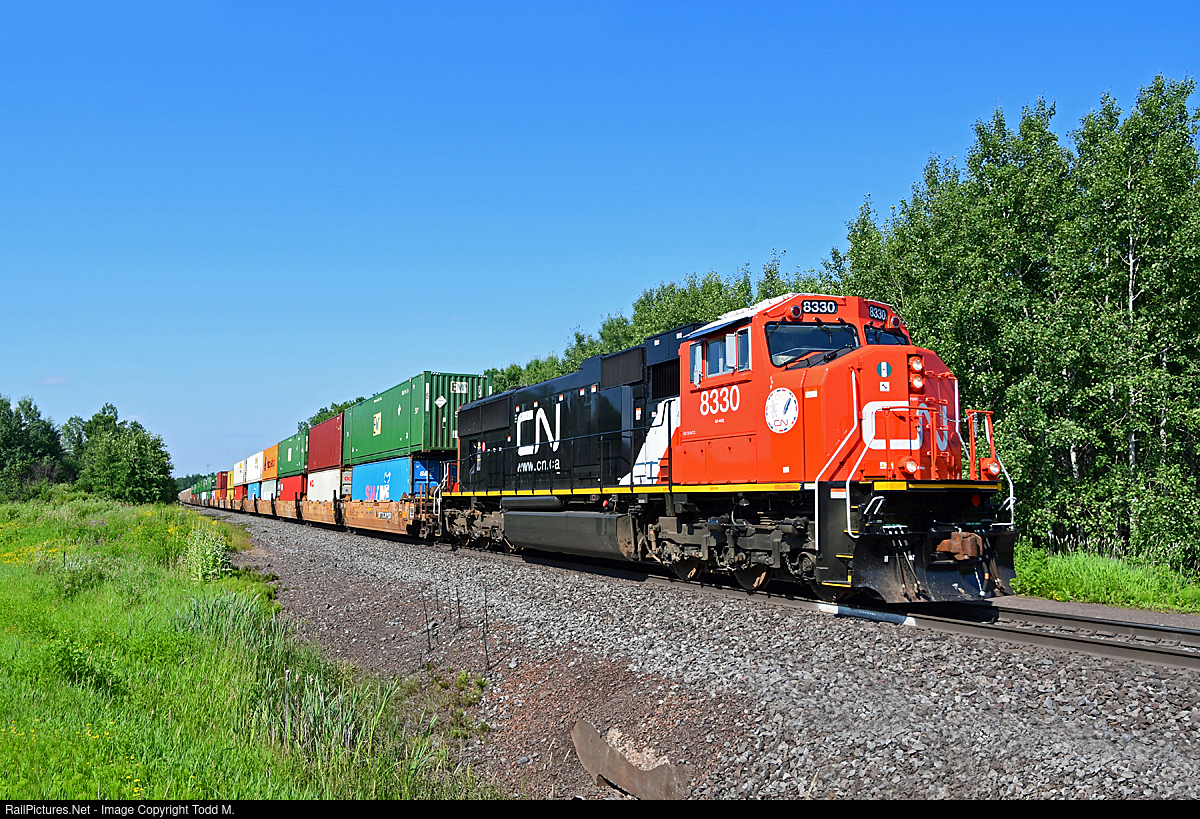 | That new train smell? A very fresh SD75IACC leads M357 north as it heads to the border crossing at Ranier, MN and cross into Canada. |