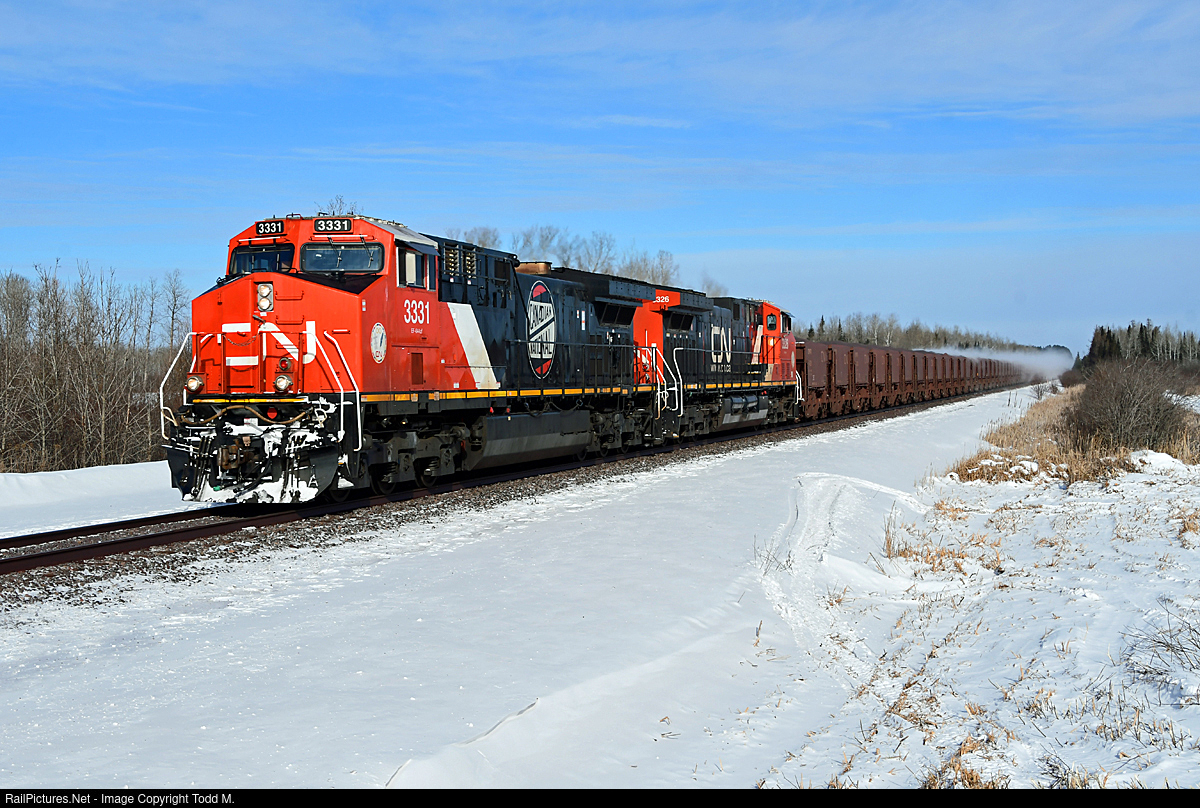| Wearing a unique throwback logo that really stands out, CN 3331 leads taconite loads down to Proctor yard. |