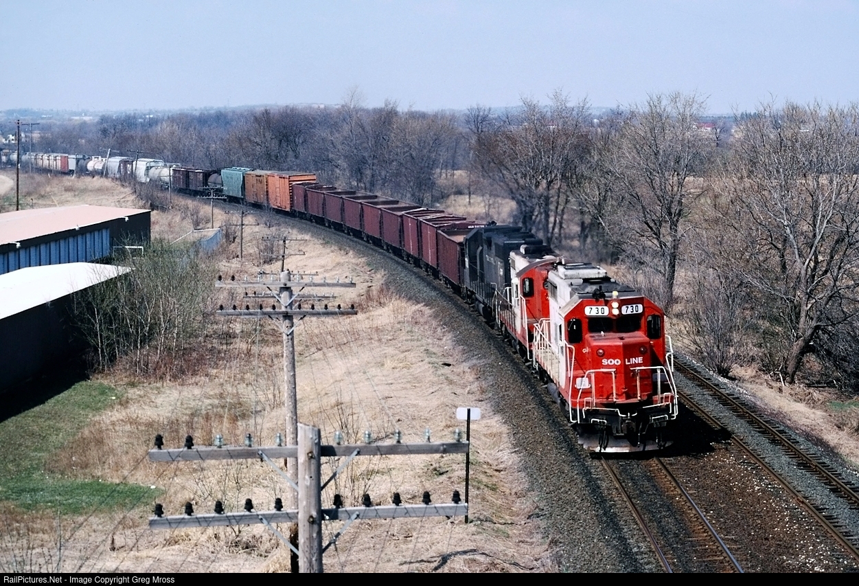 Soo Line 730 leads a Lake States train thru Pewaukee, WI in April of 1987. The train is approaching Duplainville on the original Soo Line. Lake States was a short lived (2/86 to 10/87) division of the Soo Line that was eventually sold to the Wisconsin Central. Lake States, like neighbor FRVR, was known for its use of vintage power that had been in use for decades.