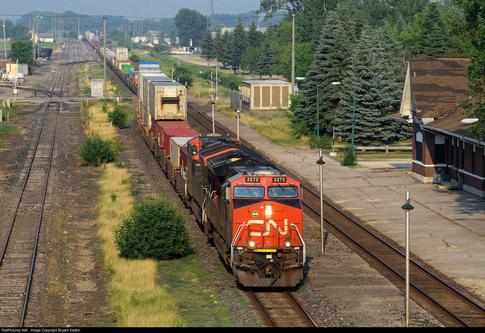 | After holding east of town for the eastbound Canadian to make it's station stop, a lengthy westbound CN intermodal train behind two Tier 4 GEVO's makes its way through Portage la Prairie, MB. With limited time for railfanning on a family trip to Winnipeg, I was happy to get a good shot of a westbound here, even with the run of the mill power. |