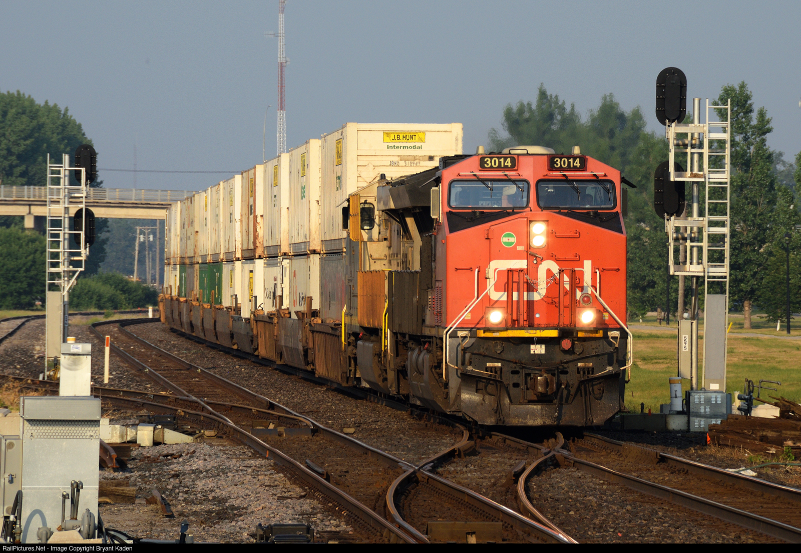 | With a going away shot of the Canadian and a shot of a westbound from the overpass in the bag, I figured I'd start making my way back toward Winnipeg, but CN had another westbound lined through town right behind the previous train. Domestic containers follow two more GE's through Portage la Prairie. I figure three trains in about 30 minutes isn't too shabby, even for this busy location. |