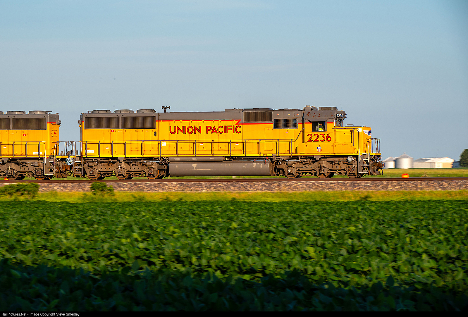 Union Pacific Railroad's M-BNAS (Manifest Bloomington-Alton Southern) rolls into the siding at the North end of McLean, Illinois as it prepares for a rolling meet with a Northbound stack train on Thursday evening, July 10, 2025. The locomotive was built by EMD LaGrange as UP SD60 6077 in May of 1988, rebuilt by UP in November of 2014 as an SD62.