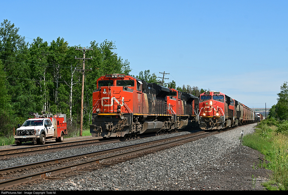 | Now with a fresh crew on board, CN 8018 waits for traffic to pass by on the main here at S. Virginia. The Herzog ballast train will drop the rock along the CN Iron Range Sub once they get moving. |
