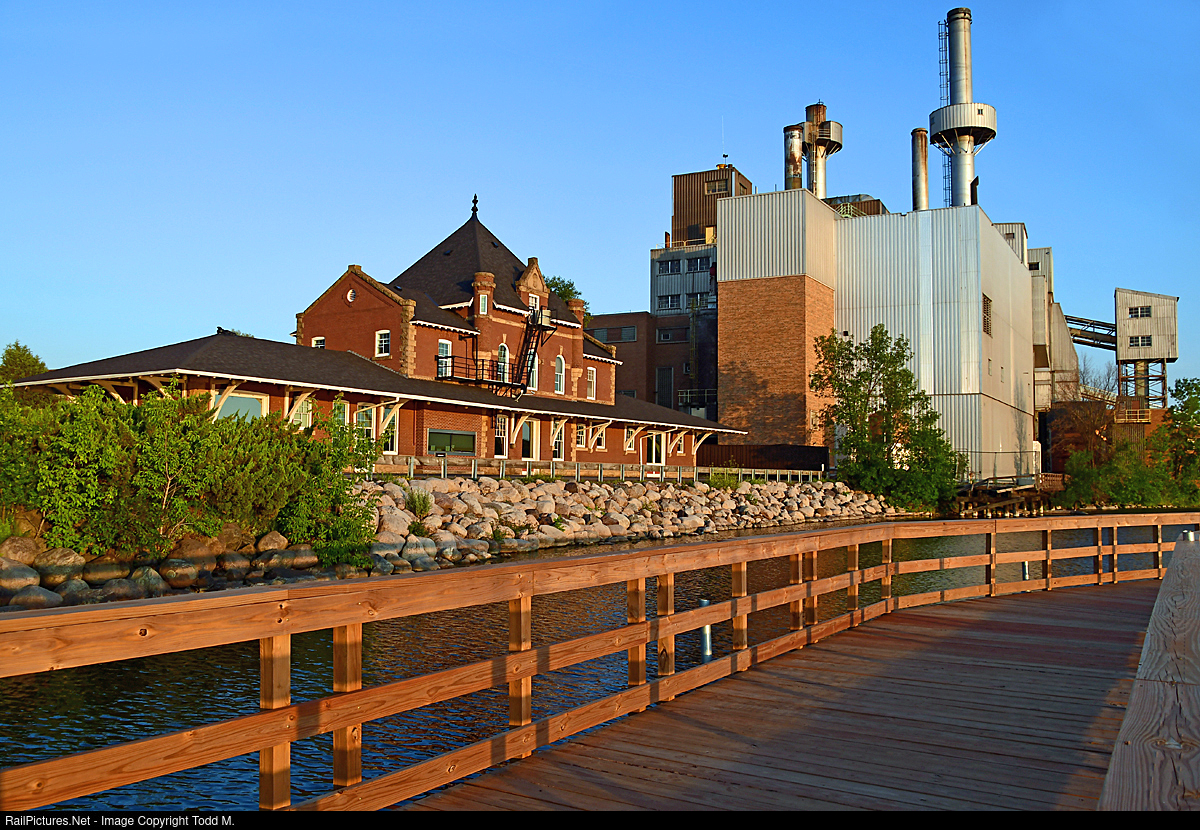 | The former DW&P Depot near the end of Chestnut Street in Virginia, MN basks in the evening sun on the shore of Silver Lake. The three-story depot was built in 1913 on pilings and concrete and made of sandstone and brick. The building was built to provide passenger service to Virginia and did so for the DW&P for many years until July 1, 1961. The station was sold to Northern State Bank in the late 70's and functions today as the home of the local bank. The other structure is the Virginia Public Utilities steam plant which used to receive coal via the DM&IR. Photo taken from the new floating walking/biking/fishing trail built recently by the city. |