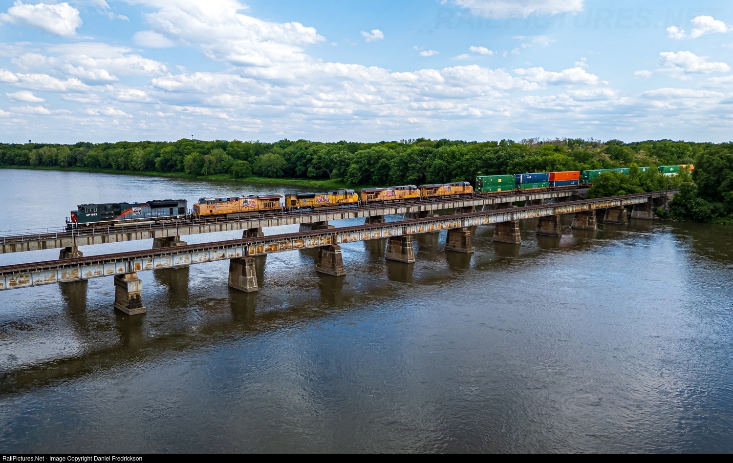 UP 1983, Union Pacific's Western Pacific heritage unit, hustles across the Kankakee River bridge on BNSF's Chillicothe Subdivision with ZCIG4, nearing its terminus of Global 4 in Joliet, IL.
